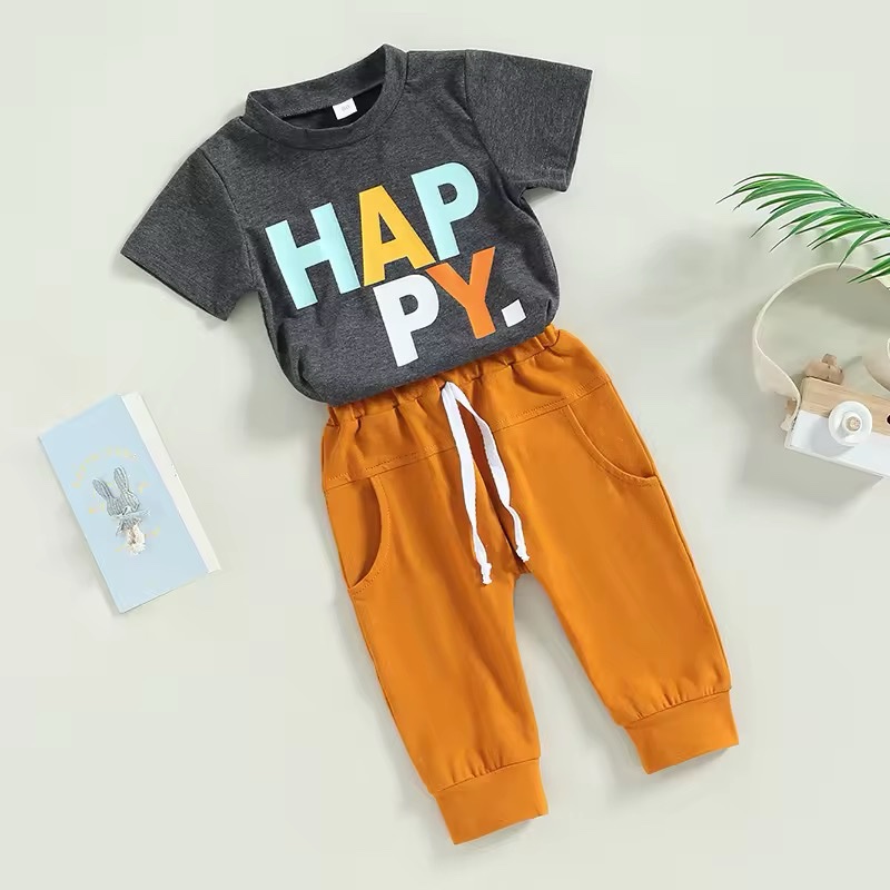 Brighten up your child’s wardrobe with our cheerful “Happy” T-Shirt and Orange Joggers Shorts Set! This adorable outfit features a soft, charcoal gray tee with a vibrant graphic in multicolored letters, paired with lightweight Orange Joggers pants. Both pieces are made from comfortable, breathable cotton blend fabric, perfect for everyday adventures and playdates. The pants come with an elastic waistband and side pockets for practicality.